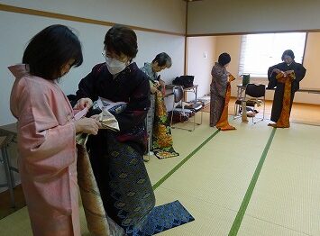 身体の前で結んで後ろに回す結び方は、一人で楽にできます。基本の着付けから、名古屋帯や細帯などの変わり結びも学べます。