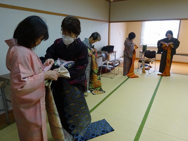 身体の前で結んで後ろに回すので、帯結びが一人で楽に出来、基本の着付けから変わり結びまで学びます。